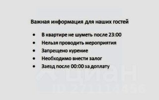 • Курение, вечеринки и шум в ночное время строго запрещены. Квартира предназначена исключительно для проживания, коммерческая деятельность запрещена.