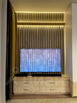 5 режимов освещения студии с декоративной подсветкой ТВ зоны. Дизайнерское зеркало, удобный раскладной диван 2х2 метра.