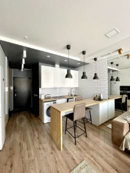 Студия в отличном состоянии, сделанная для себя. Новая современная мебель с доводчиками Mr Doors, качественно спланированное хранение, современная новая бытовая техника Bosch. Стирально-сушильная машина Siemens позволит сэкономить место и время на сушке белья. Канальная скрытая система кондиционирования с режимами охлаждения и нагрева воздуха в студии.
