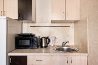 -полный комплект посуды, столовых приборов и современной бытовой техники.