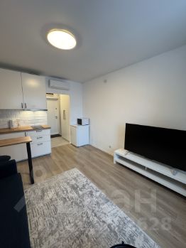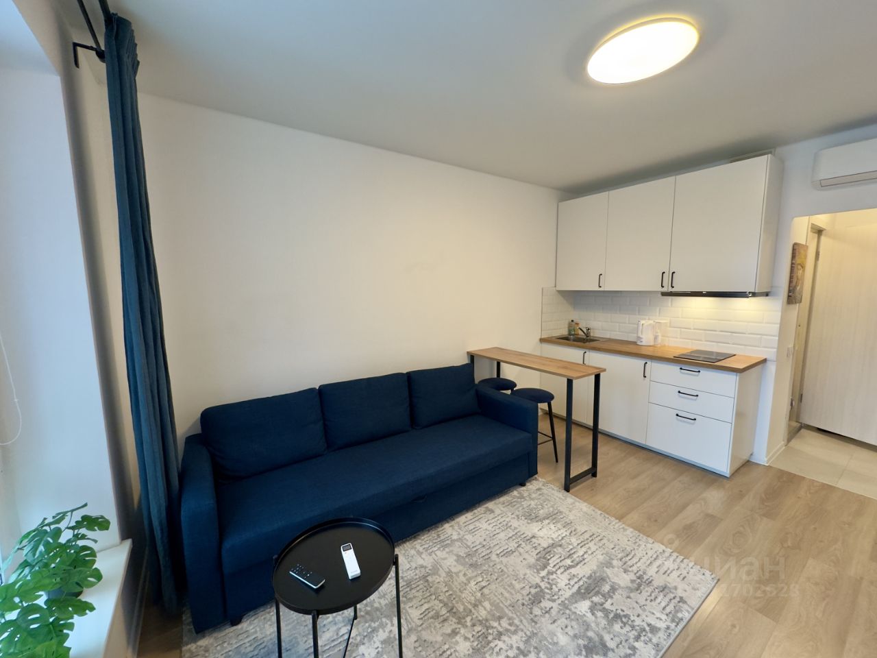 В комнате установлен удобный диван для сна с ящиком, кухня с экономичной встраиваемой техникой (плита, вытяжка, стиральная машина), кондиционер, тихий холодильник, барный стол на двух человек, два барных стула и журнальный столик, ТВ-тумба.