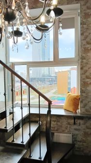 Собственником сдаются уютные, видовые двухуровневые апартаменты с красивыми видами из окон (одни из немногих в этом доме). Сделан качественный, дизайнерский ремонт, установлены мебель и бытовая техника. На обоих этажах санузлы.