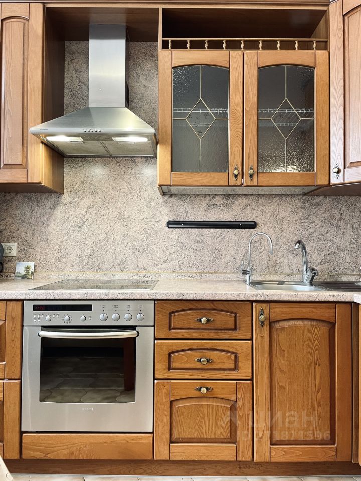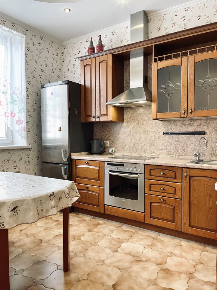 кухонный гарнитур, холодильник, духовка, варочная панель, вытяжка, эл. чайник, посудомойка, СВЧ, телевизор и установлен стационарный фильтр для очистки питьевой воды. Тёплый пол от отопления.