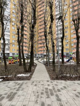 Вокруг дома прекрасный зеленый двор, много деревьев, детские площадки, сквер для прогулок с лавочками.