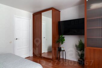 - В комнате размещена двуспальная кровать (160х200) с ортопедическим матрасом и белоснежным постельным бельём, двуспальный диван (140х190), ТВ 50" со Smart-TV, большой шкаф-купе.