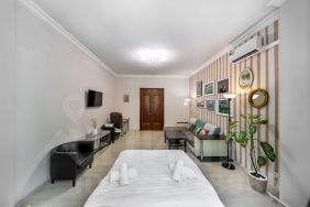 В спальне двуспальная кровать и большой раскладной двуспальный диван, качественное бельё из сатина, телевизор, журнальный столик и кресла, место для работы. Во второй спальне две двуспальные кровати и телевизор.