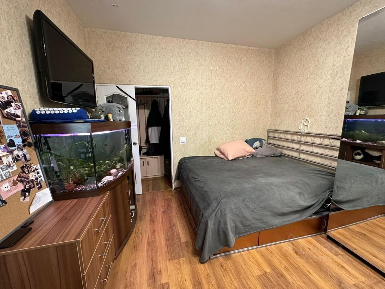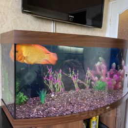 Украшение квартиры огромный аквариум с рыбой. Аквариумист оплачивается за счёт средств хозяев . Уход простой -1 раз в день еда. В замен Вам прекрасный вид и подсветка ночью и релакс .
