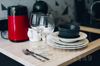 -микроволновая печь, индукционная плита, вытяжка, чайник, набор кастрюль и посуда.