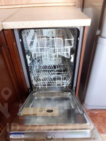 Встроенная кухня укомплектована бытовой техникой: посудомоечная и стиральная машины, холодильник, духовка, варочная панель.