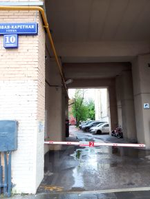 Во дворе дома расположена стихийная парковка, въезд на территорию через шлагбаумы.