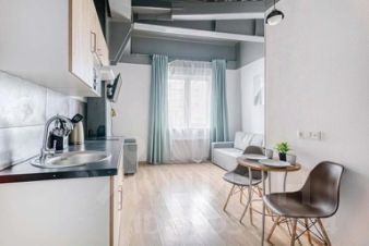 Апартаменты - студия в ЖК Парк Легенд. Несмотря на небольшую площадь, квартира с раздельными спальными местами. Большой двуспальный диван и односпальное кресло, которое также раскладывается. Есть обеденная зона, телевизор, кухня со всей бытовой техникой и стиральная машина.