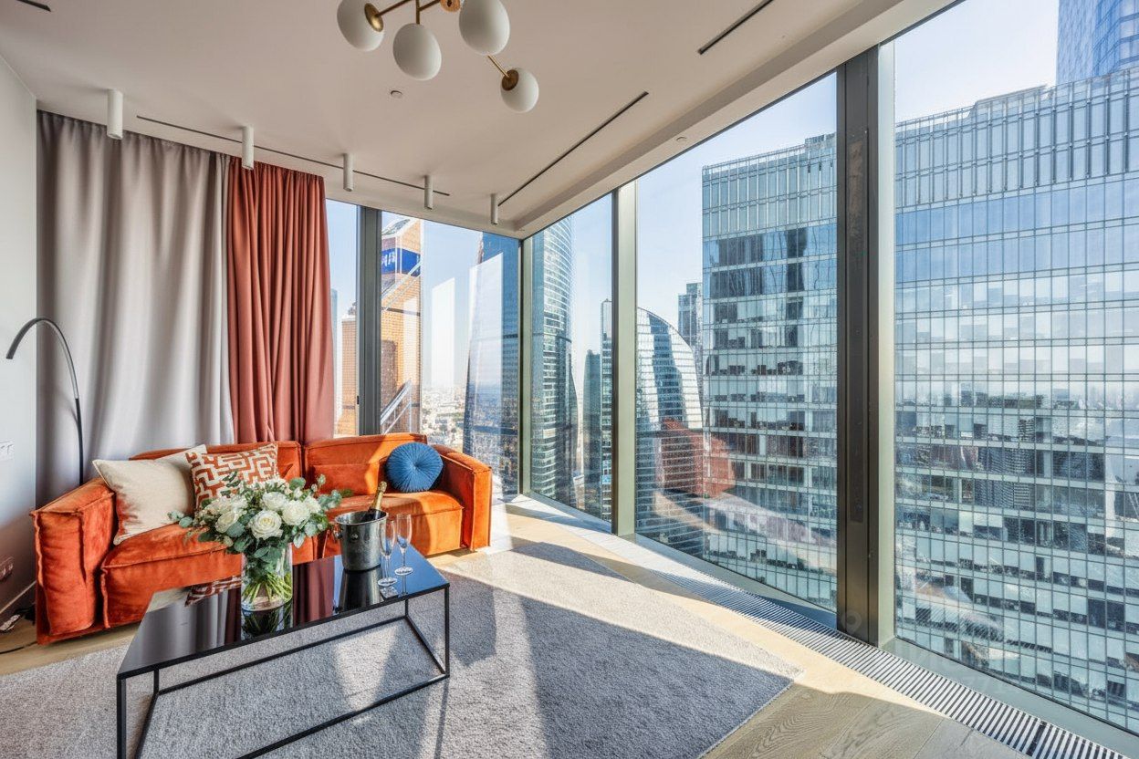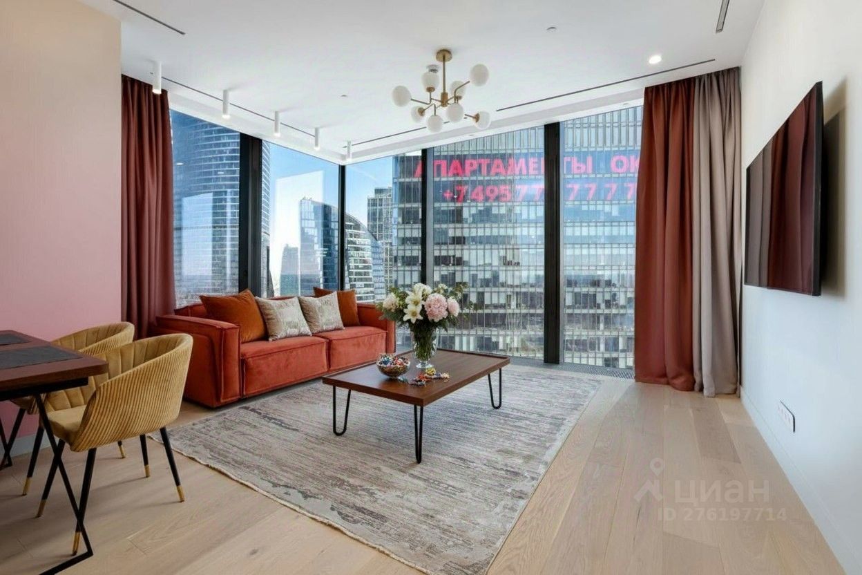Угловой апартамент с панорамным видом и просторной уютной гостиной создаст полное погружение в красоты Москва Сити.