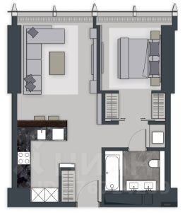 Гостиная студийной планировки, спальня с вместительной системой хранения и собственной ванной комнатой, постирочная комната.