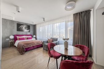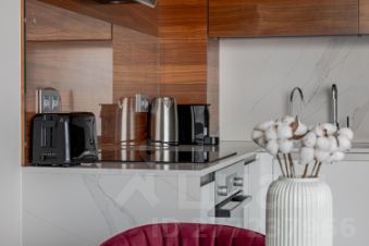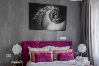 Отделка выполнена в современном стиле. Большие окна во всю стену, дизайнерская мебель, текстиль и уникальные элементы декора подарят незабываемые ощущения комфорта.