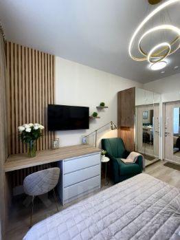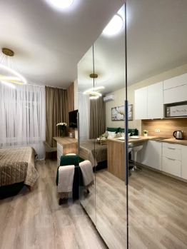 В апартаментах-хороший новый ремонт, есть все для комфортного проживания: кондиционер, двуспальная кровать с ортопедическим матрасом, стол-комод с полноценным рабочим местом,телевизор, кресло, шкаф, антресоль для вещей, холодильник, двухконфорочная плита, вытяжка,микроволновая печь, чайник,стиральная машина, пылесос,стремянка, гладильная доска, утюг, постельное белье, регулируемые барные стулья, в ванной установлен электрический полотенцесушитель, а также скрытая сушилка для белья, светодиодное освещение, управляемое с пульта управления.
