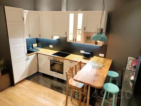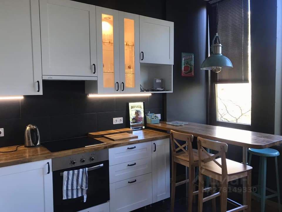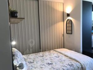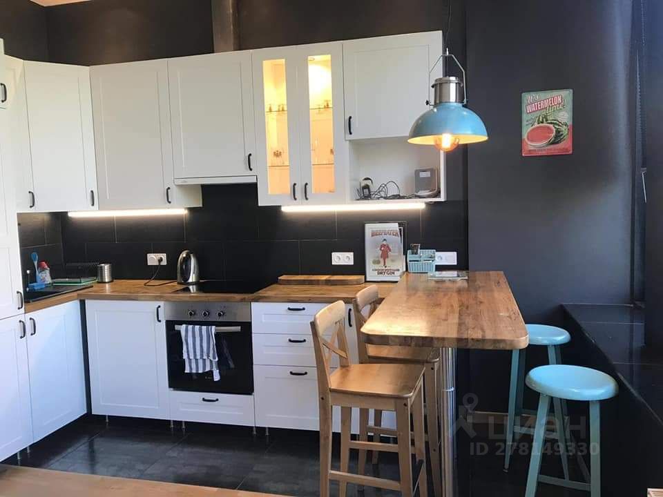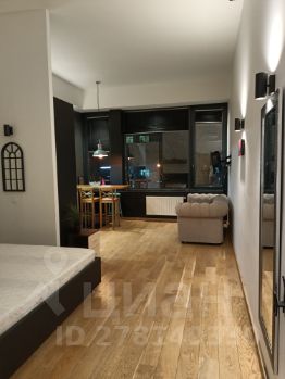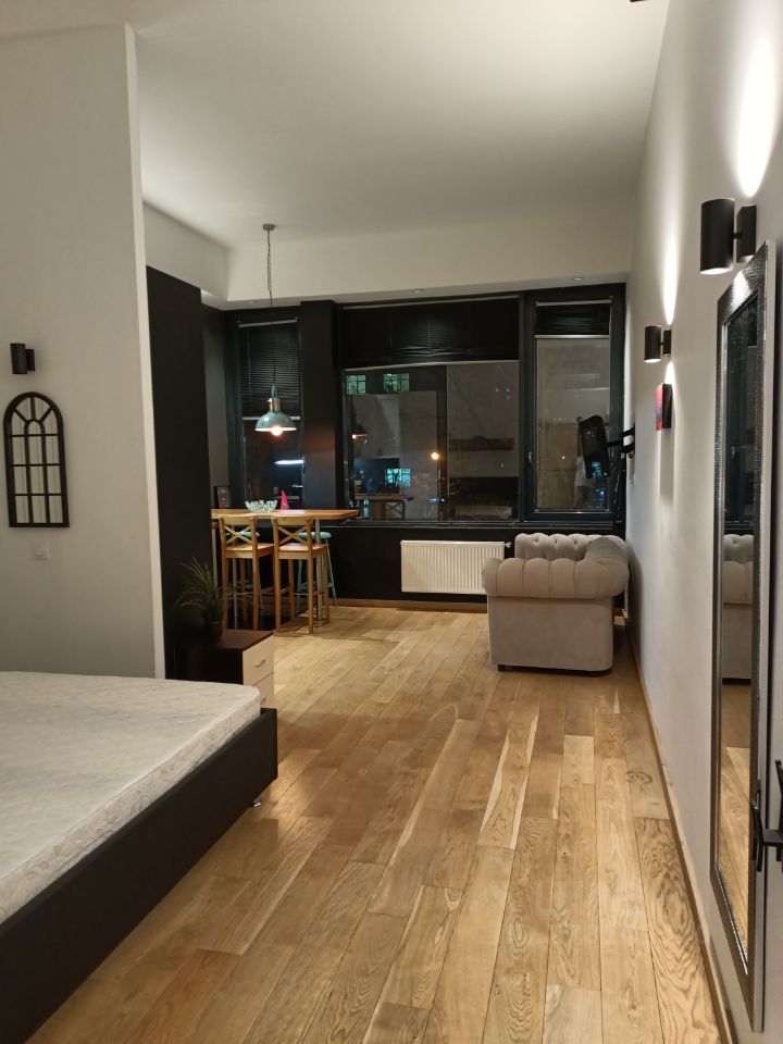 Студия расположена на 4-м этаже. Одну стену целиком занимают высокие панорамные окна, выходящие на бульвар. Общая площадь 35 квадратных метров, 4-х метровые потолки, центральная система кондиционирования. Студия оснащена полноценной кухонной зоной с высоким столом, плитой, посудомоечной машиной, микроволновкой и духовкой. В спальной зоне располагается двуспальная кровать размером 140/200 и встроенный вместительный шкаф-купе. В ванной комнате оборудован итальянский душ, установлена стиральная машина.