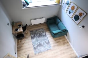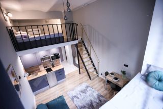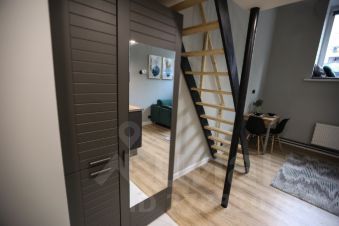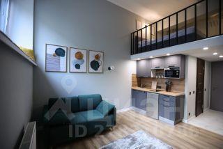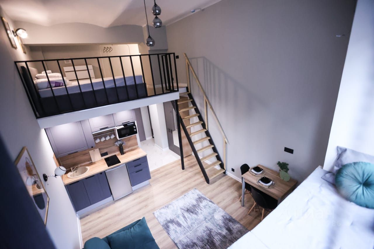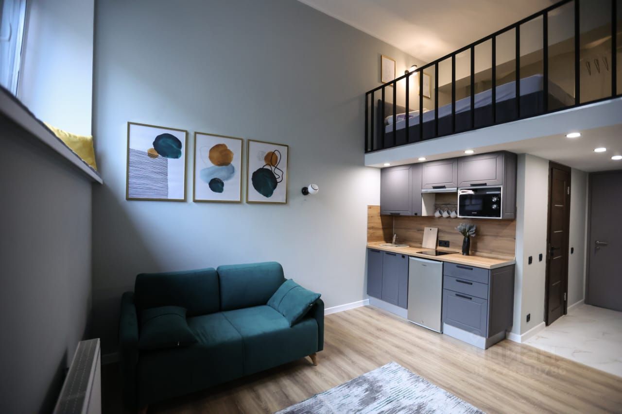 Апартаменты общей площадью 31 кв.м. на первом этаже с высоким сводчатым потолком высотой 4,2 метра (высота потолков на втором уровне 2 метра).