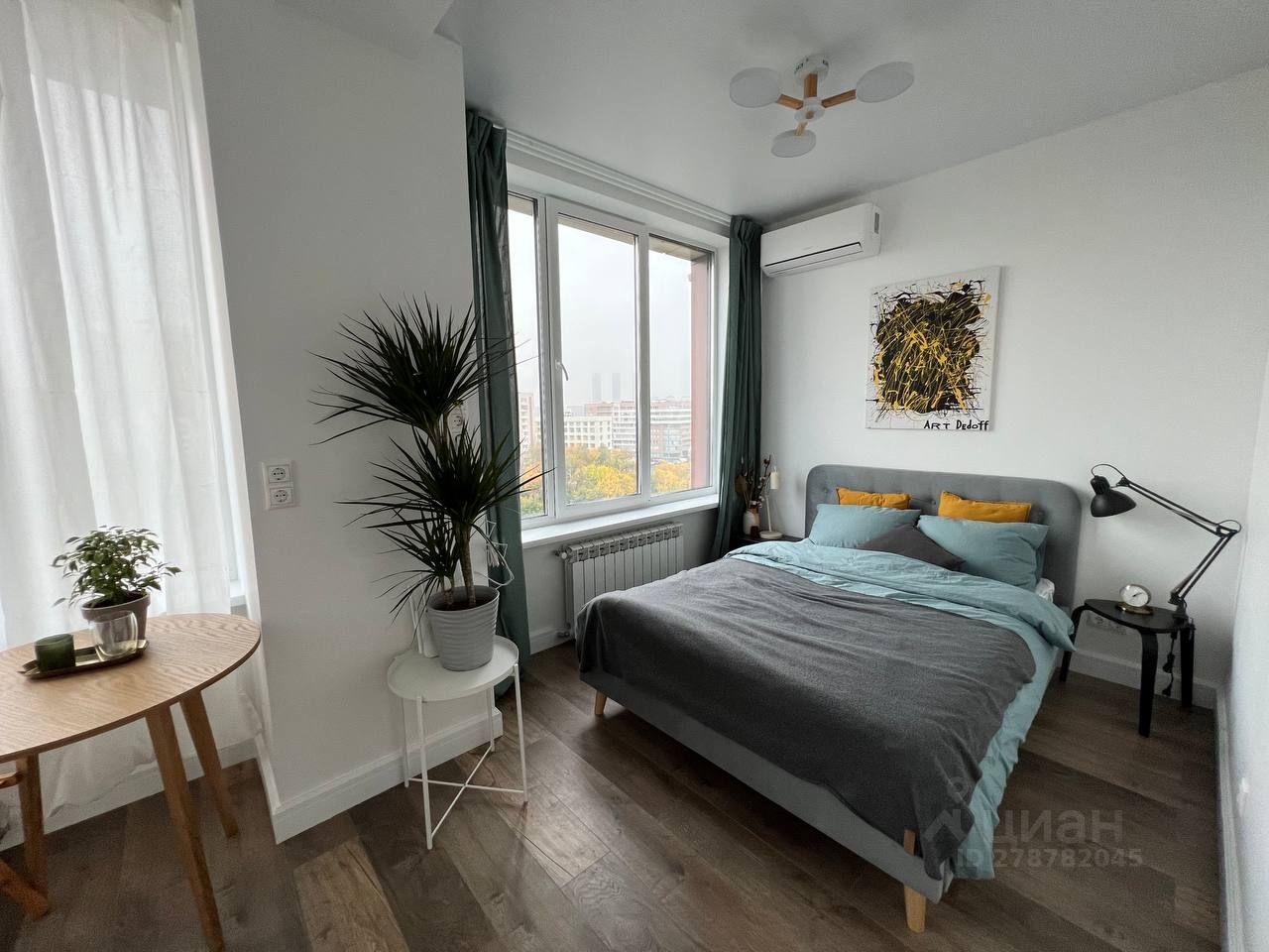 Из мебели: кровать с подъемным механизмом, шкаф, тумба, кухонный стол + стулья, прикроватная тумба, рабочие лампы