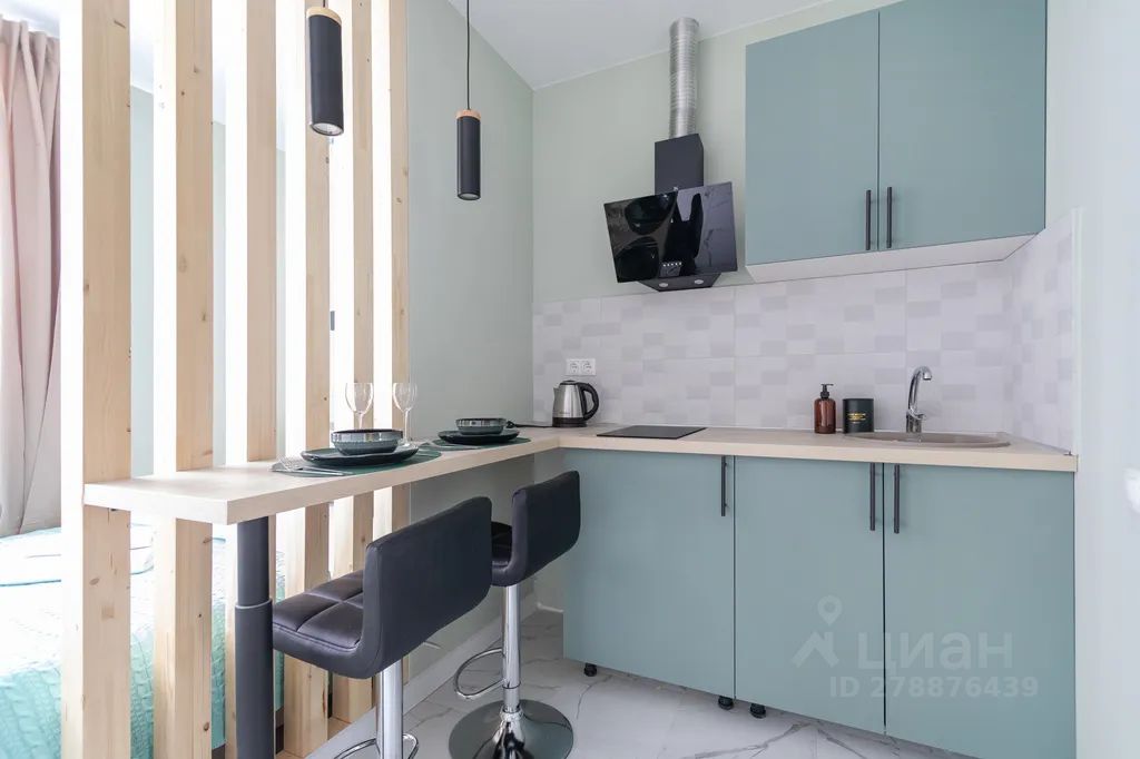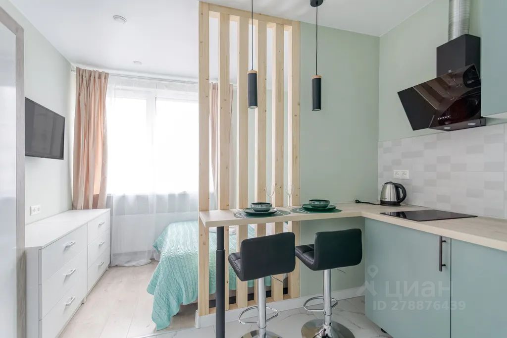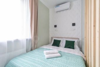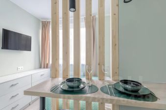 В студии есть всё необходимое для проживания. Двуспальная кровать, телевизор, обеденная зона и кухня с необходимой бытовой техникой. Также есть вся посуда для приготовления еды. В ванной комнате есть собственная стиральная машина, по этому студию можно снять не только на сутки, но на более длительный срок.