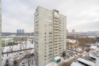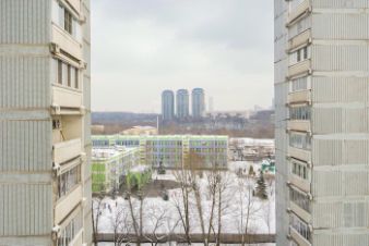 В одной спальне двуспальная кровать, прикроватные тумбы, встроенный шкаф, телевизор. Панорамный вид из окна на Поклонную гору.