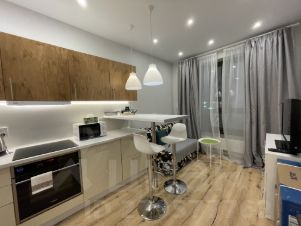 Стильная, полностью готовая к Вашему приезду квартира порадует Вас, если Вы любите чистоту, комфорт и уют домашней обстановки и цените высокий уровень сервиса!Кухня-гостиная.