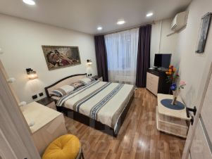 Техника: встроенные посудомоечная и стиральная машинки, варочная панель, духовка и микроволновка. Всё для готовки имеется. В квартире есть три вместительных шкафа-купе (зеркальные), тёплые полы и кондиционеры. Спальные места: двухместная кровать, большой раздвижной диван на 3 человека вместимости, маленький диван вместимостью до 2-х худеньких человека и две прочные раскладушки. В санузлах и в коридоре ночная подсветка.