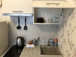 Оборудованный кухонный гарнитур со всей необходимой техникой(чайик, микроволновая печь, холодильник) посуда для приготовления еды ( кастрюля, сковородка), а так же тарелки, бокалы, стаканы, кружки и столовые приборы.