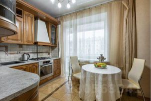 В квартире тихо, несмотря на близость правительственной трассы. Окна выходят во двор, а на лоджии можно приятно отдохнуть с видом на сквер и фонтан.