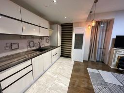 Кондиционер, приточная вентиляция, подогрев полов, домофон с видеонаблюдением, высокоскоростной интернет. Оборудование: стиральная машинка, встроенная кухня с посудомойкой, микроволновка, холодильник, диван, кровать, два больших шкафа для одежды, бытовые принадлежности, ТВ.
