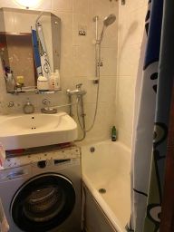 В квартире есть все необходимое для проживания: холодильник, микроволновка, мебель, (диван Икеа, который раскладывается в кровать, с ровным, как у кровати, спальным местом), стиральная машина, посуда, утюг, гладильная и сушильная доски и тд.