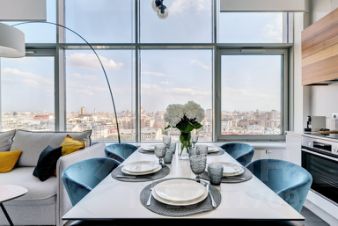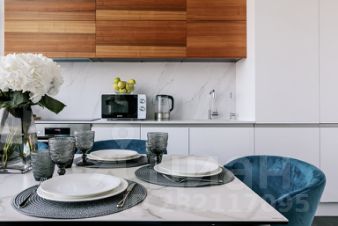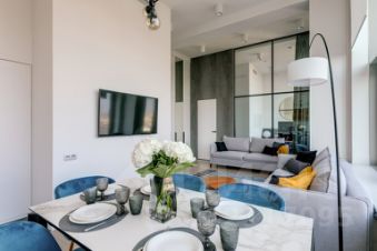 Для проведения вечеринок в апартаментах имеется стол-трансформер, за которым могут разместиться до 12 человек.