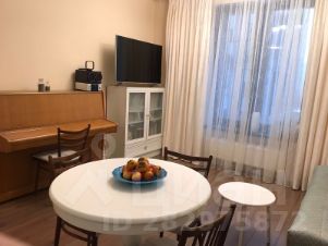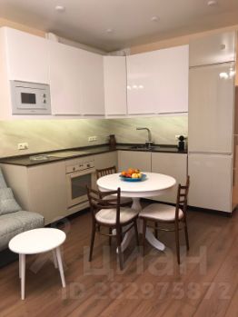 Совмещенная светлая большая гостиная с панорамным окном и зоной кухни, вся необходимая встроенная техника(плита, духовка, посудомоечная машина). Современный интерьер, комфортный раскладывающийся диван (дополнительное спальное место), обеденный стол.