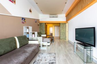 Спальные места: 2 + 2 + 2 + 1. Большая двуспальная кровать в спальне, два раскладных двуспальных дивана в гостиной, односпальная кровать в дополнительной спальне.