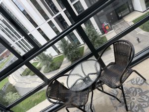 Уютная лоджия с панорамными окнами также наполняет комнату светом. Кофейный столик со стульями даёт возможность порелаксировать за чашечкой кофе, а можно и поработать за ноутбуком в тёплое время года.