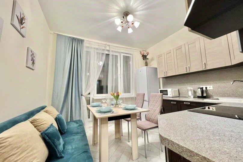 плита, духовой шкаф, холодильник, микроволновая печь, чайник, набор посуды;