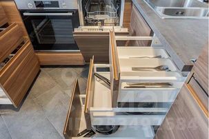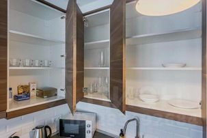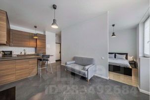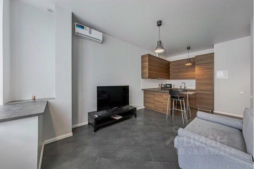 Квартира оформлена в современном стиле, в светлых оттенках. Кухня, соединенная с гостиной, полностью укомплектована новейшей техникой и посудой. Также здесь расположен диван и телевизор. Вы сможете насладиться любимыми фильмами и сериалами.
