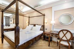 В спальне красивая двуспальная кровать с ортопедическим матрасом, качественное бельё из сатина, шкаф, кресло, туалетный столик, сейф. Выход на балкон с местом для отдыха/курения и красивым видом.