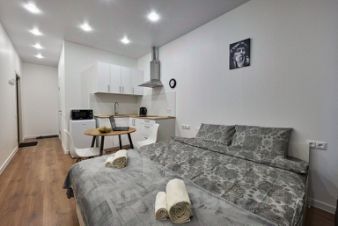 На полностью оборудованной кухне апартаментов вы сможете приготовить любые блюда, а на удобной кровати погрузиться в глубокий сон. Постельное бельё и банные принадлежности, вместительный шкаф доступны каждому гостю.