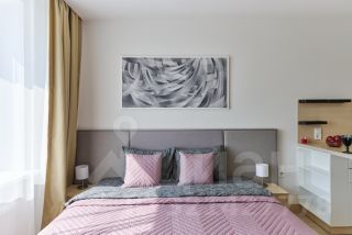 Спальня: двуспальная кровать King Size, большой телевизор со smart TV, автоматические шторы, умный дом, управляемый через яндекс-станцию Алиса.