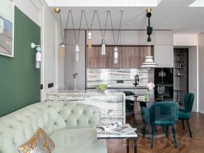 Отделка подоконников, кухни и декоративных элементов натуральным камнем. Многоуровневый свет, дизайнерские люстры и бра.
