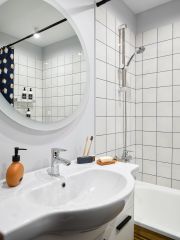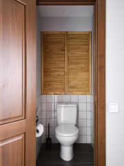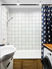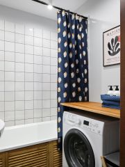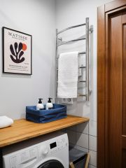 Раздельный санузел, стиральная машина и электрический полотенцесушитель.