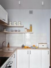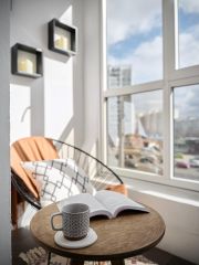С 8-ми метровой кухни выход на панорамную лоджию с зоной отдыха. Плита и духовка, вытяжка, посудомойка, холодильник, чайник, фильтр для воды.