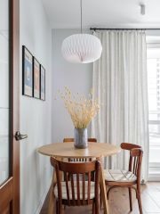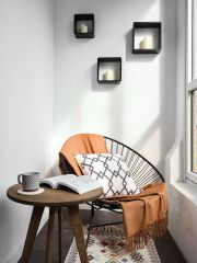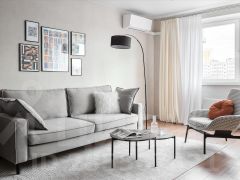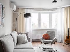 В квартире гостиная с эркерным окном, выходящим на Севастопольский проспект, диваном, рабочей зоной и кронштейном под телевизор. Разные сценарии освещения-верхний свет, торшер, настольная лампа.