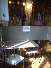БАЛКОН: мебель светлая, остекление раздвижное, линолеум, стены пластик под мрамор.