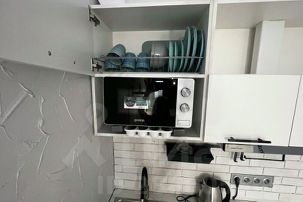 После прохода в основной зал, слева располагается кухонная гарнитура, где можно легко приготовить ужин. Кухонная гарнитура оборудована компактной 2-конфорочный сенсорной плитой, чайником, чашками, посудой, бокалами, все и столовыми приборами, а также кастрюлей и сковородкой.