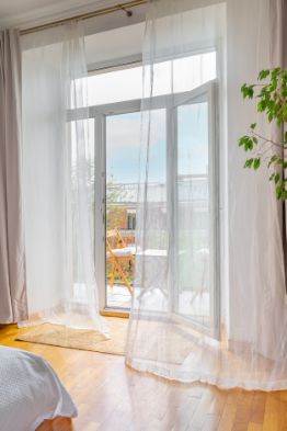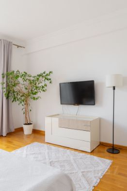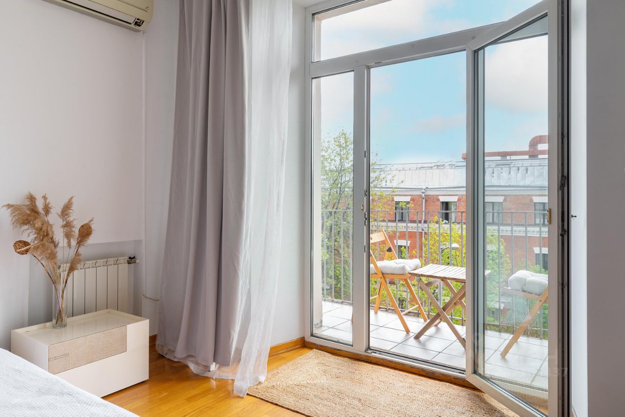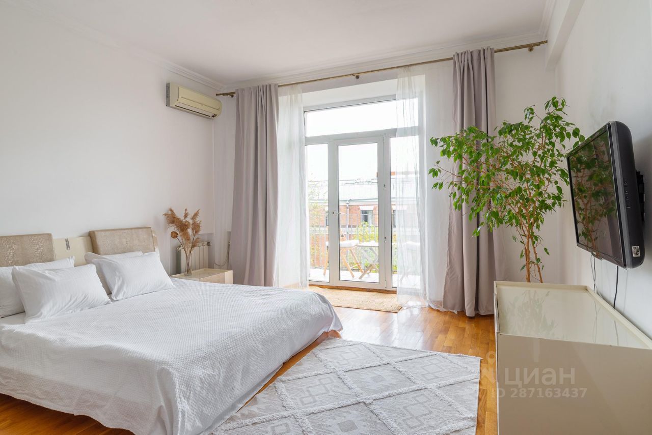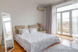 В квартире большая просторна спальня с о открытым балконом.