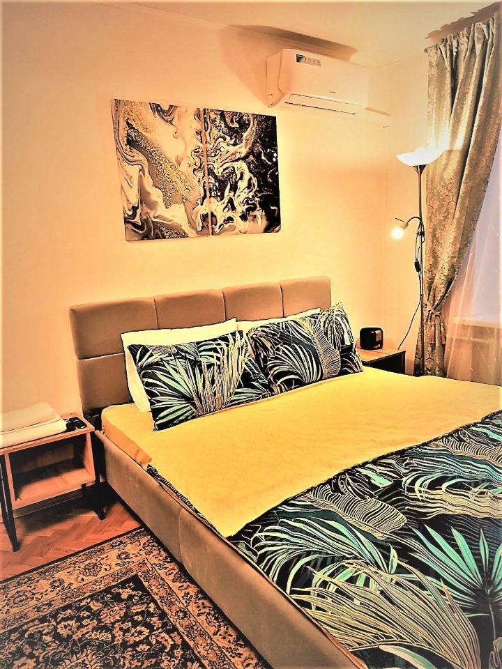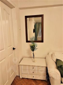 Есть большая двухспальная кровать (160х200 см) и такой же ширины раскладной диван, большой шкаф-купе, где поместятся все вещи.