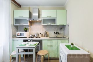 Встроенная кухня: холодильник, газовая варочная панель, микроволновка, чайник. Имеется набор посуды для приготовления, посуда для сервировки стола, столовые приборы, кружки, бокалы и пр. Санузел, совмещенный в плитке до потолка, душевая кабина, стиральная машина. Так же имеется утюг, гладильная доска, сушилка для белья, фен. При заселении предоставляется белье, полотенца банное и ручное. Есть необходимые туалетные принадлежности.