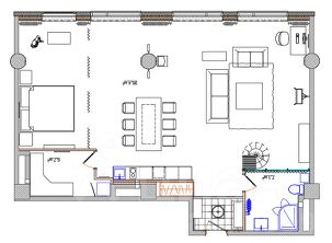 Расположение: кухня + гостиная, спальня, с/у совмещен (душевая кабина) и гардеробная. Есть антресоль со стильным подъемом по винтовой лестнице (можно использовать как дополнительное спальное место или для хранения вещей).