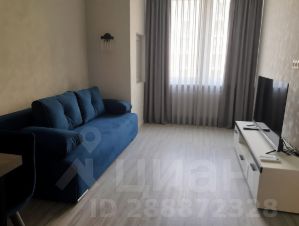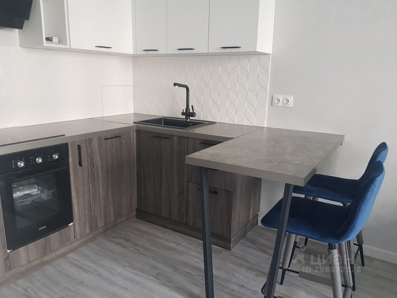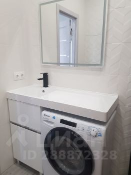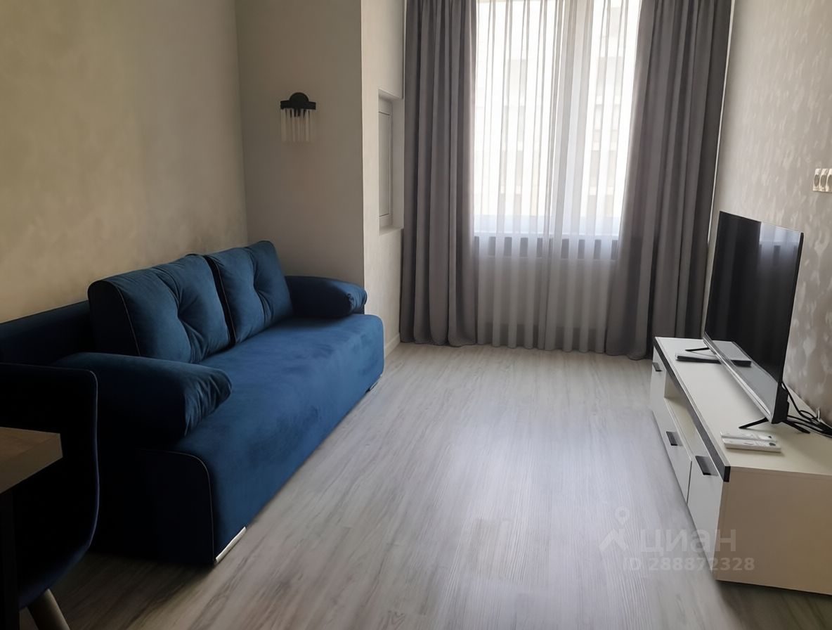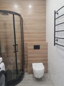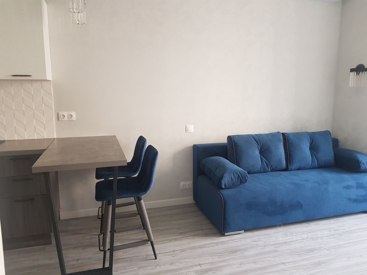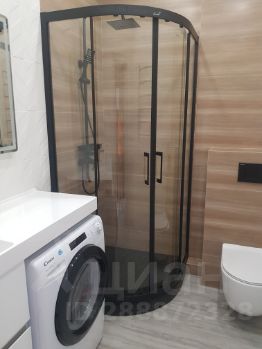 Кухня отделена от зоны гостиной барным столом. В гостиной раскладной диван, тумба с телевизором. Санузел совмещенный с душевой кабиной, стиральная машина встроена под столешницу с раковиной.